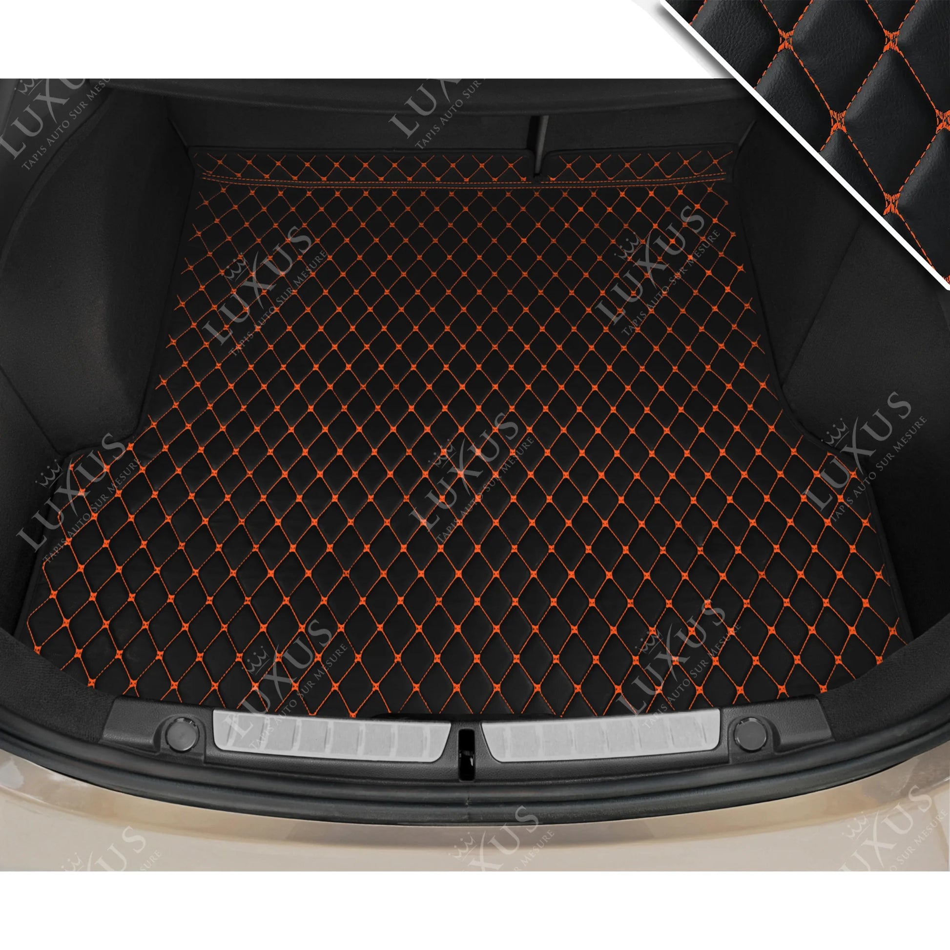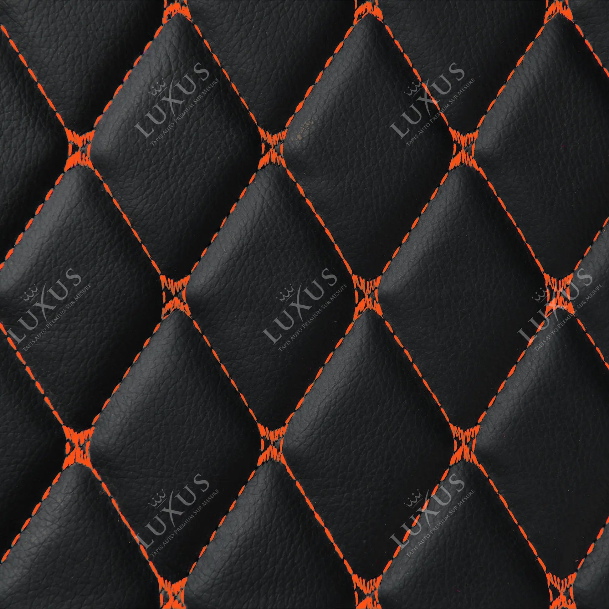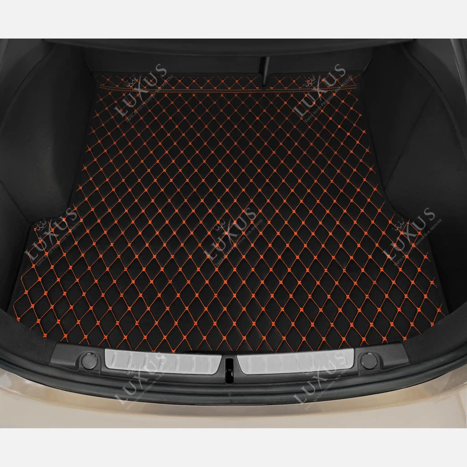Tapis de Coffre sur Mesure Premium Luxus – Motif Losange Noir avec Surpiqûres Oranges
