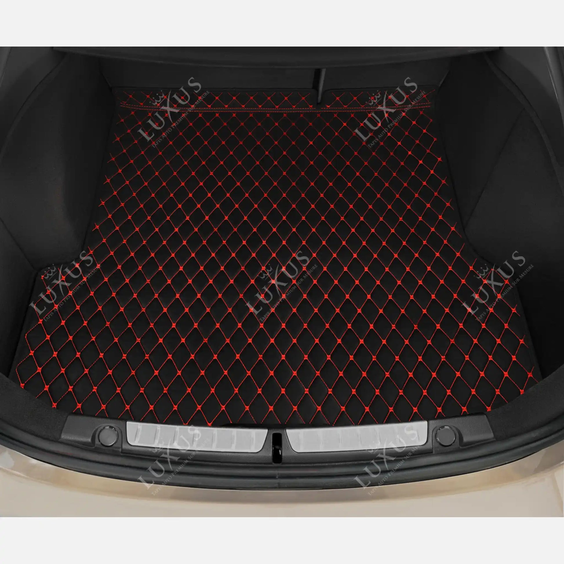 Tapis de Coffre sur Mesure Premium Luxus – Motif Losange Noir avec Surpiqûres Rouges