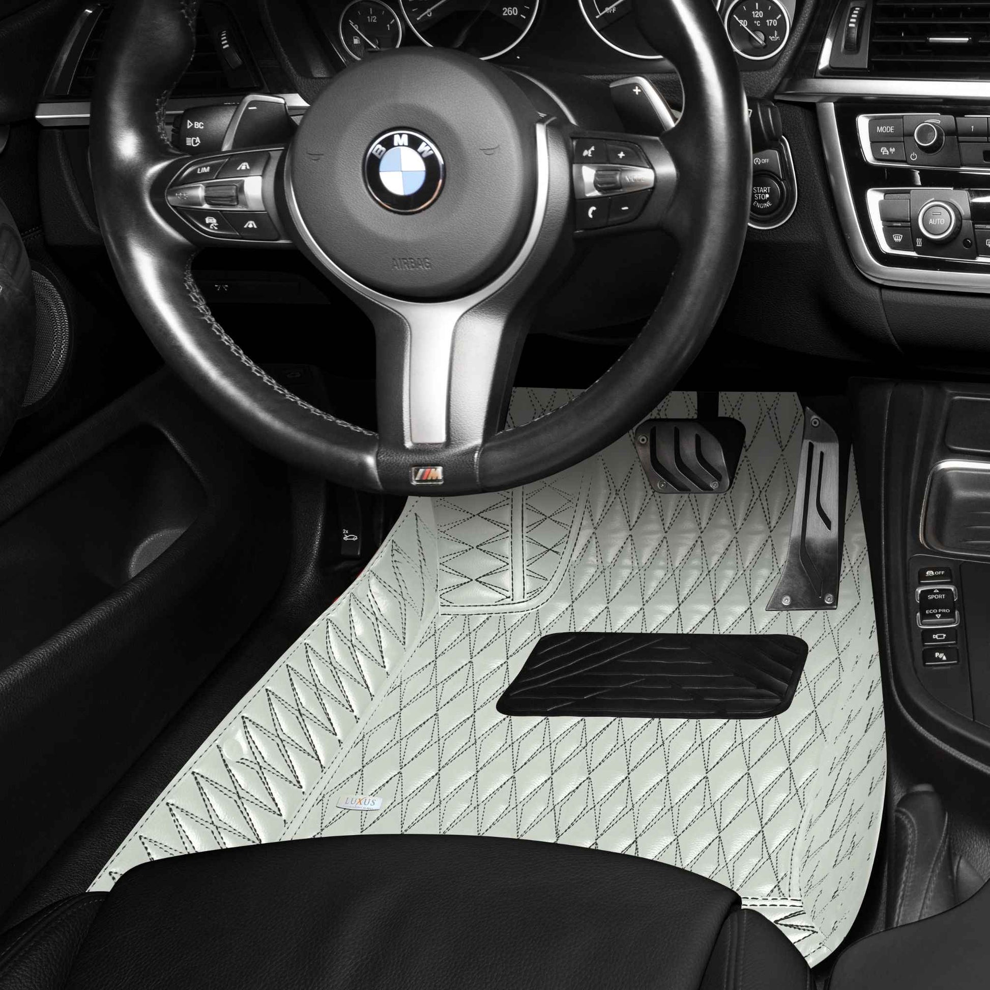 Tapis de Sol 3D sur Mesure Premium Luxus – Motif Double Losange Blanc Neige avec Surpiqûres Noires